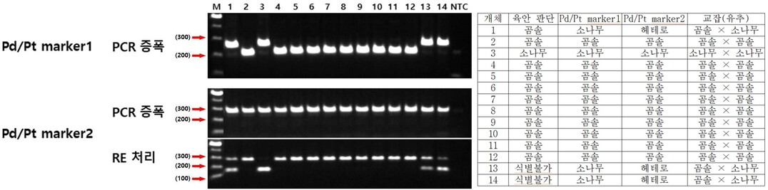 이에 연구진은 소나무류에서 엽록체는 부계로, 핵은 부계와 모계 각각 절반씩 유전되는 특성에 착안해, 엽록체 및 핵 유전체 염기서열을 비교·분석했다. 그 결과 자연집단에서 자생한 나무의 부모 수종을 유추할 수 있는 엽록체 기반 INDEL(삽입·삭제) 및 핵 기반 CAPS(절단 증폭 다형성) 분자표지 2종을 개발해 특허 출원을 완료했다. 이번에 개발된 분자표지는 유전자원 및 육종집단 관리뿐만 아니라 종자 및 목재 유통 관리에도 폭넓게 활용될 것으로 기대된다.