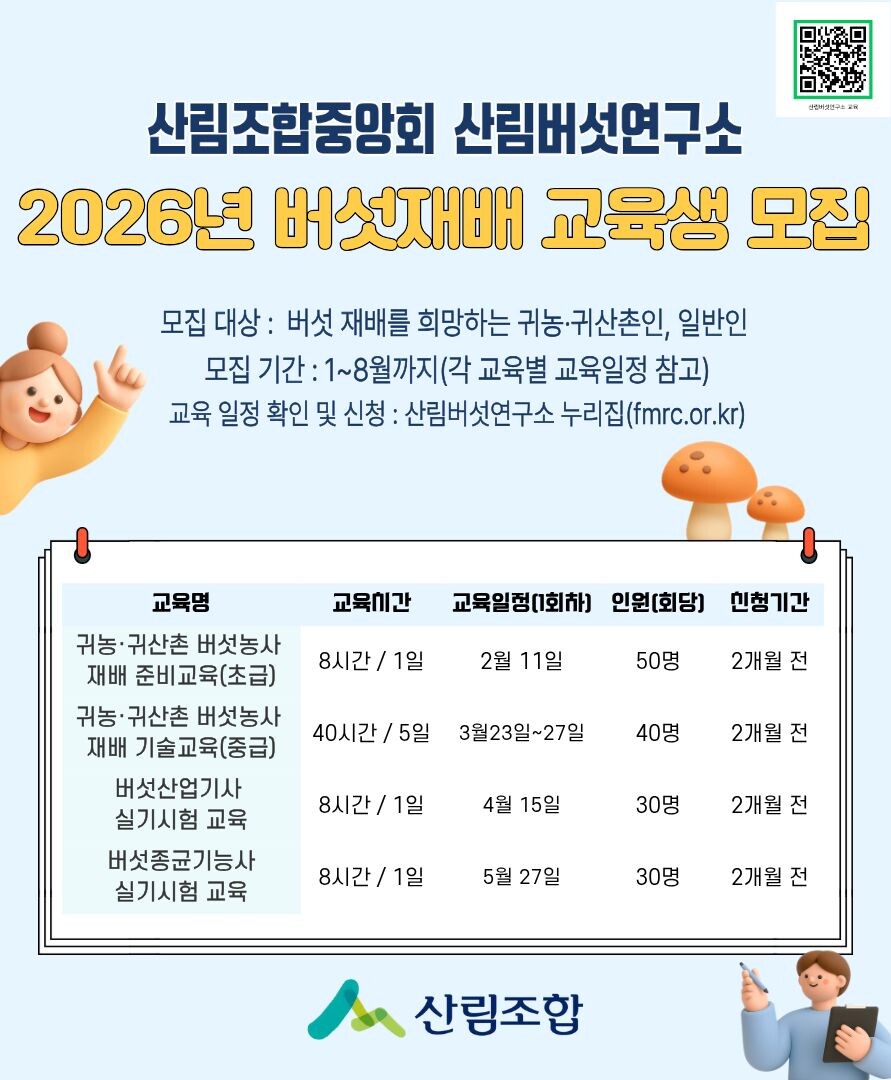 산림조합중앙회 임산물유통본부 산림버섯연구소(연구소장 김희선)에서 ‘2026년도 버섯재배 교육’을 수강할 교육생을 모집한다.