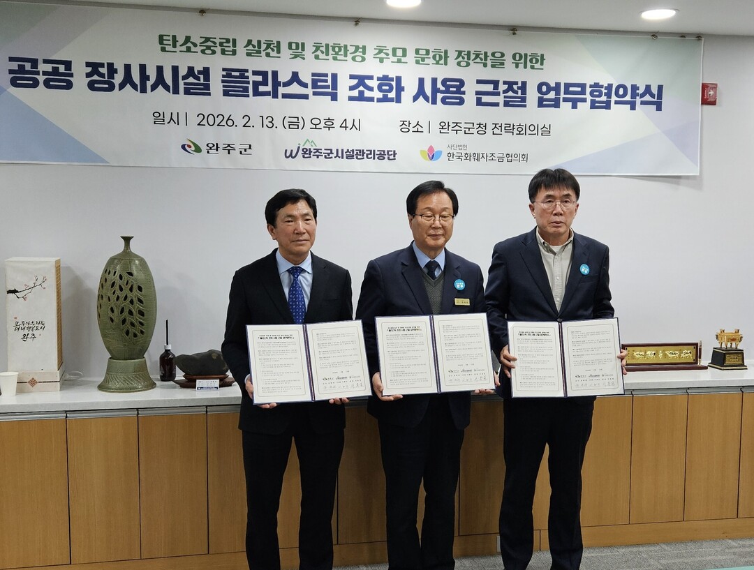 (사)한국화훼자조금협의회(회장 서용일)는 지난 13일 전북 완주군청 전략회의실에서 탄소중립 실천 및 친환경 추모 문화 정착을 위한 ‘공공장사 시설 플라스틱 조화 사용 근절 업무협약’을 체결했다. 협약식에는 한국화훼자조금협의회, 완주군, 완주군시설관리공단이 참석했다.