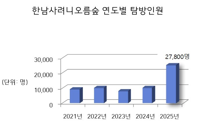 이러한 매력에 힘입어 2025년 탐방객 수는 전년 대비 3배 이상 증가한 2만 7천명을 넘어섰다. 특히 재방문율이 16%에 달하고, 제주도민이 아닌 방문객 비율이 75%에 이르는 등 명실상부 전국적인 산림 명소로 자리잡았다. 국립산림과학원은 높아진 탐방 수요에 대응해 편의시설 보완과 환경 개선을 지속적으로 추진할 예정이다.