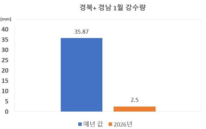 올해 1월 전국 누적 강수량은 예년 대비 19.4% 수준에 머물러 있으며, 특히 경북은 15.3%, 경남은 1.4% 수준으로 강수량이 극도로 적은 상태다. 또한 전국 상대습도는 47.2%로 예년(55.5%)보다 8.3% 낮아졌으며, 1월 부터 동해안 지역에 발효되었던 건조특보가 내륙까지 확대됨에 따라 매우 건조한 지역이 넓어지고 있다.