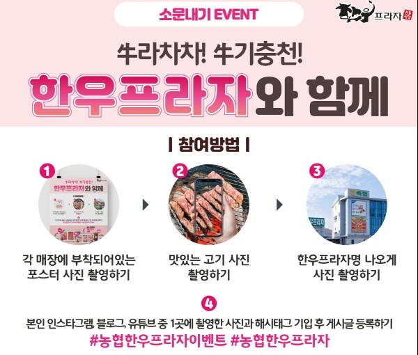 참여방법은 전국 한우프라자 식당형 매장(총 99개소)내 부착된 포스터, 맛있는 고기와 방문 한우프라자명을 촬영 후 본인의 인스타그램, 블로그, 유튜브 중 한 곳에 촬영사진과 함께 ‘#농협한우프라자 #농협한우프라자이벤트’ 해시태그 및 게시글 공유 후 댓글을 남기면 된다.