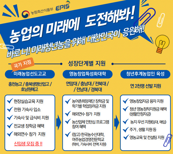 이번에 신입생을 모집하는 미래농고는 ‘홍천농업고등학교(강원 홍천)’, ‘충북생명산업고등학교(충북 보은)’, ‘호남원예고등학교(전남 나주)’의 세 곳이며, 3개 학교 모두 2016년 미래농고로 선정되어 현재까지 운영 중이다.