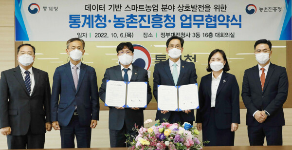 농촌진흥청(청장 조재호)과 통계청(청장 한 훈)은 10월 6일 대전 통계청에서 ‘데이터 기반 스마트농업 분야 상호발전을 위한 농업자료 활용 협력’에 관한 업무협약(MOU)을 체결했다.