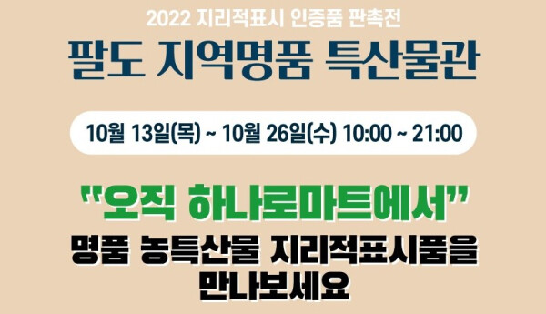 농림수산식품교육문화정보원(원장 이종순)은 농협 하나로마트 양재점에서 지리적표시 인증품 판촉 행사인 ‘팔도 지역명품 특산물관’이 오는 10월 26일까지 운영된다고 밝혔다.