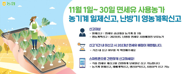 농협(회장 이성희)은 「농 축산 임 어업용 기자재 및 석유류에 대한 부가가치세영세율 및 면세 적용 등에 관한 특례규정」에 의거, 11월 1일부터 30일까지 면세유를 사용하는 농어업인으로부터 ‘농업기계 일제신고 및 난방기 재배계획’ 신고를 받는다.